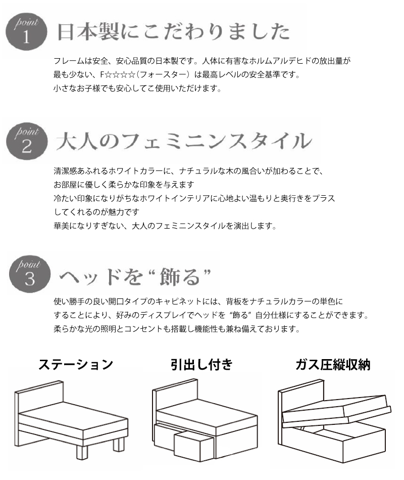大人綺麗めのホワイトベッドフレームです。奥行きをしっかりとったがボリュームデザイン。